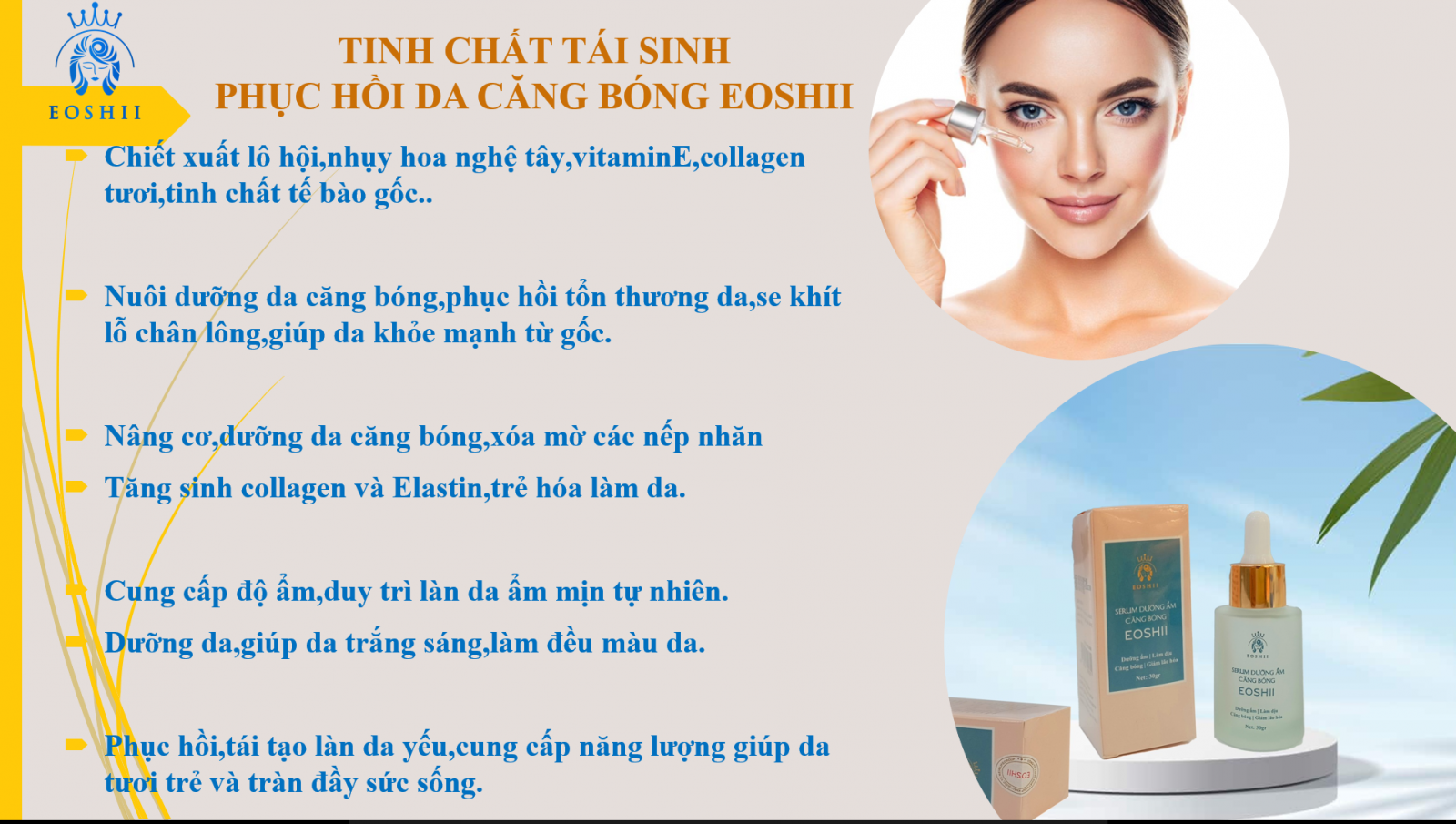 Tên sản phẩm: Serum dưỡng ẩm căng bóng EoShii Công dụng: - Dưỡng ẩm, làm dịu, căng bóng, làm tăng độ đàn hồi của da, làm giảm các dấu hiệu lão hóa